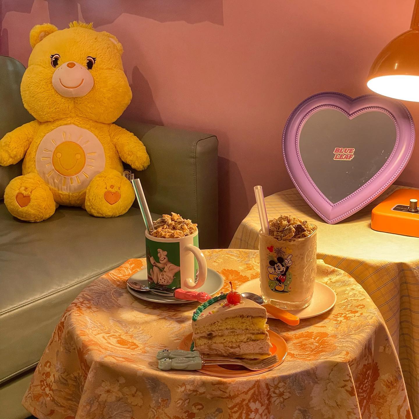 다양한 스타일이 혼합된 건축을 포용하는 미학인 커틀코어가 요즘 대세인 가운데, 블루 리프는 이러한 트렌드를 완벽하게 구현한 카페입니다. 산리오 수집품과 테디베어 모양의 크림 케이크는 이 Y2K에서 영감을 받은 카페가 제공하는 것 중 빙산의 일각에 불과합니다.