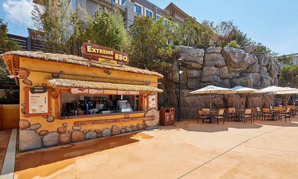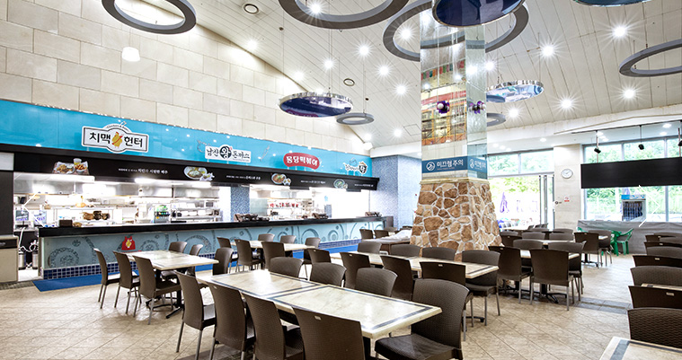 물놀이 공원 안에는 햄버거 스테이크와 같은 서양 음식부터 치메크(닭과 맥주 세트)와 같은 한국 요리에 이르기까지 다양한 메뉴를 제공하는 푸드 코트가 있습니다.