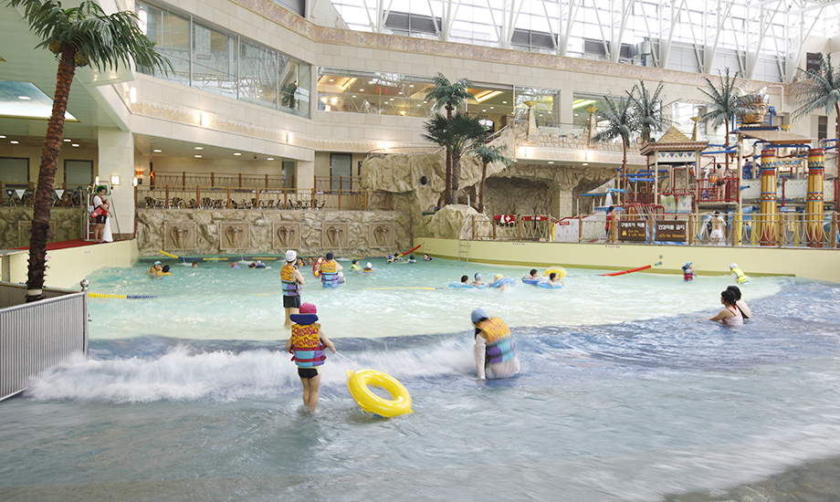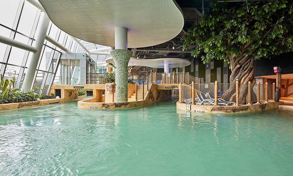 2.4 미터 높이의 파도에 의해 튀는 것을 즐기거나 수영장 기슭에 위치한 인공 섬 스파에서 휴식을 취할 수 있습니다.