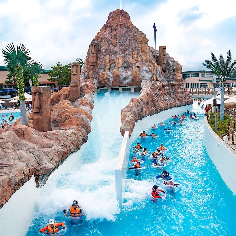 짜릿한 놀이기구를 즐긴 후 긴장을 풀기 위해 편안한 스파와 게으른 강에 몸을 담그십시오.