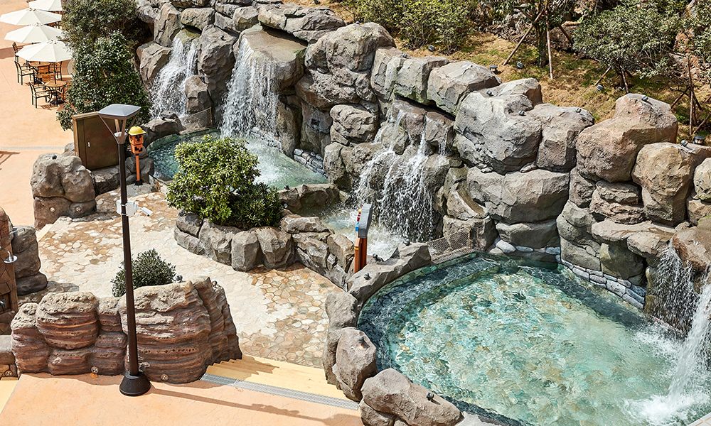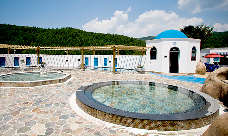 온천 물 을 이용 하는 개인 스파 시설 을 갖춘 테마 파크 의 일부 인 스파 밸리.