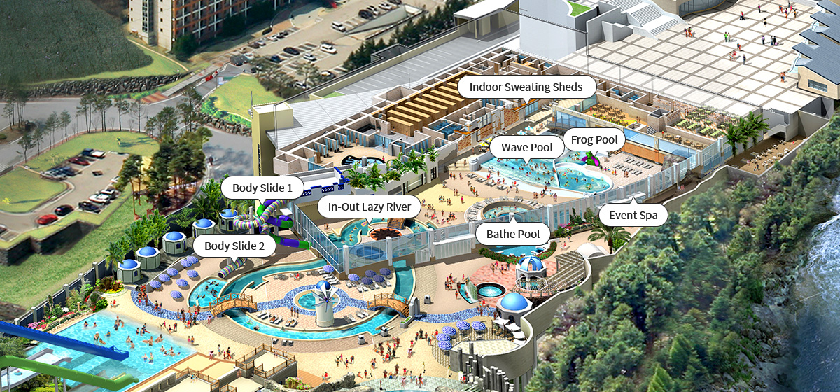 15 개 이상의 편의 시설과 물놀이를 갖추고 있으며,그라니트 층에서 나오는 천연 온천 물도 사용합니다. 관광 명소들은 5 개의 섹션으로 나뉘어져 있습니다.스파동,아쿠아동,어드벤처 아일랜드,스파 밸리,익스트림 밸리입니다.