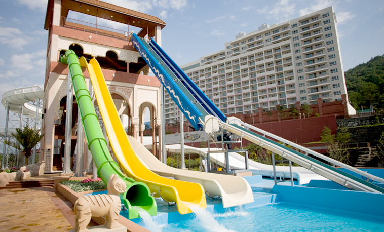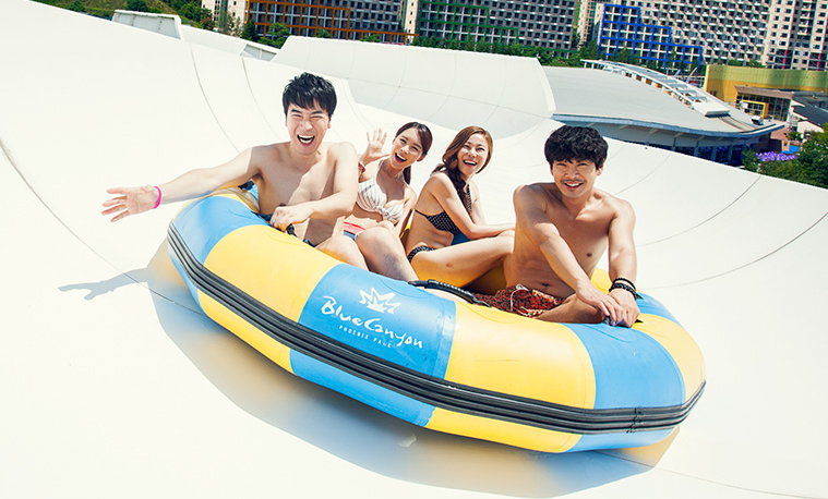 블루 캐년 물 공원은 한국 최초의 140 미터 높이의 슬라이드와 201 미터에 이르는 가장 긴 강 타기를 가진 지중해 스타일의 공원입니다.
