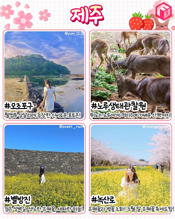 3월의 시작과 동시에 벌써 봄꽃들이 개화 소식을 알려오고 있는 제주도 입니다. 이국적인 자연 풍경과 어우러진 독특한 봄꽃들의 향연을 감상하고 싶은 분들에게 추천하는 3월 국내 여행지인데요. 드라마 웰컴투 삼달리의 촬영지로 최근 떠오르는 오조포구에서는 바다 위 이색적인 돌담길을 걸어보는 독특한 경험을 할 수 있습니다.