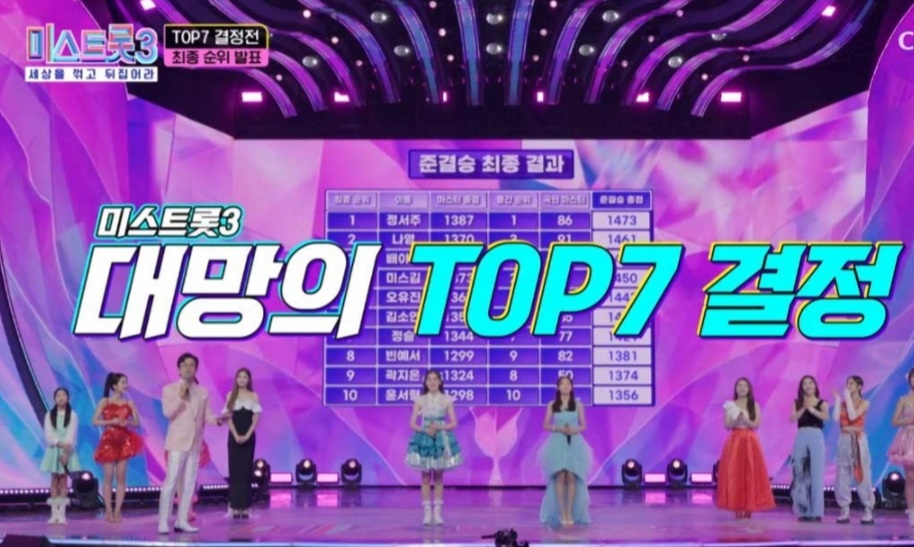 이어 4위는 미스김, 5위는 오유진, 6위는 김소연, 7 위는 정슬이 차지했다. 이들은 결승전에 진출해 '미 스트롯3' 우승에 한발짝 다가섰다.