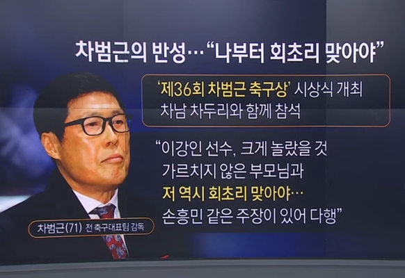 차 전 감독은 “축구 선수들을 키우는 학부모들과 무거운 이야기를 나누고자 한다”며 ‘2023 카타르 아시안컵’ 당시 있었던 손흥민(토트넘)과 이강인(파리생제르맹)의 갈등을 거론했다.