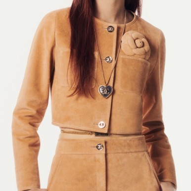 여유있는 폭의 팬츠 & 머플러 까지 전체적으론 데일 리한 분위기가 돋보였던 이번룩. 전체적인 착장에 브 라운 컬러의 크롭 기장 스웨이드 자켓으로 컬러의 포 인트를 더했습니다. 해당 제품은 샤넬의 2024 pre 봄 & 여름 컬렉션 제품으로 가격은 1000만원대.