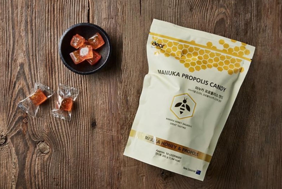디어패밀리 마누카꿀 프로폴리스 캔디는 프로폴리 스를 넣어서 만든 캔디다. 뉴질랜드 야생에서 자라 는 마누카 꽃에서 채집한 꿀을 프로폴리스와 함께 넣어서, 마누카 꽃의 은은하면서도 쌉쌀한 향기를 머금은 단맛을 느낄 수 있다. 뉴질랜드에서 제조한 완제품을 우리나라에 직수입해서, 낱개 포장으로 간 편하게 즐길 수 있도록 만들었다. 300g 용량의 종 이팩 하나의 판매가는 28,000원이다.