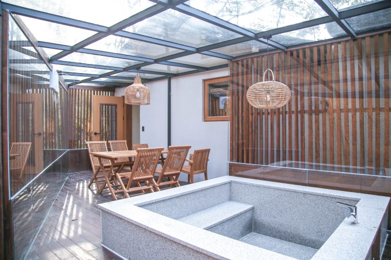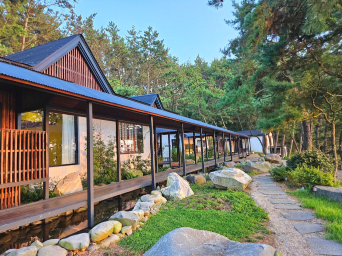 조용한 음포 해수욕장 바로 앞 일본 료칸 느낌 가득한 숙소예요. 바다도 실컷 볼 수 있고, 비와도 이용 가능한 자쿠지까지 있어요.