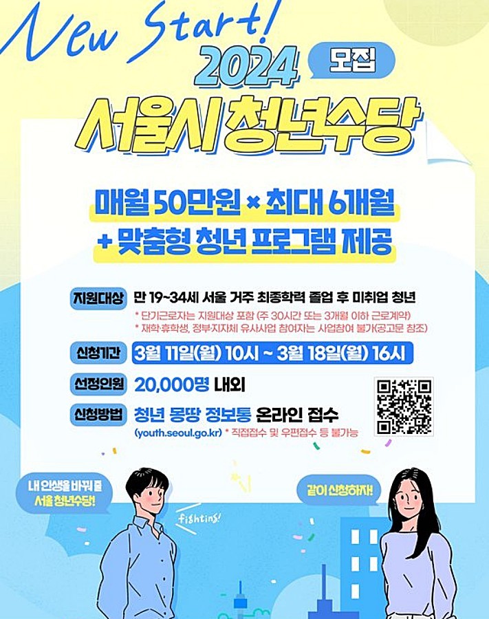 매달 50만 원씩 주는 '서울시 청년수당' 올해 모집 기간은? (+신청 방법·제외 대상) 11일부터 온라인 신청… 총 2만 명 선정 서울에 사는 청년 구직자들이 주목할 만한 소식이 떴다.