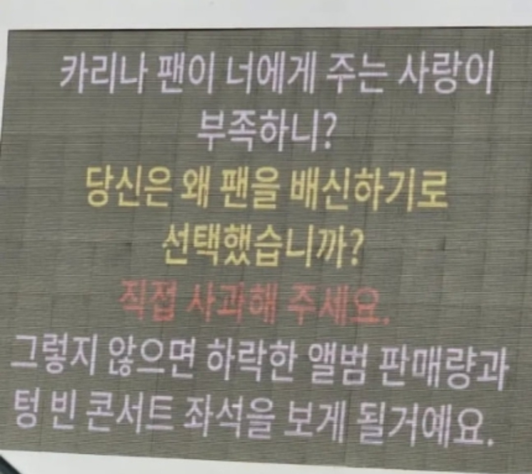 트럭 시위 문구에는 "카리나 팬이 주는 사랑이 부족 하냐. 왜 팬을 배신하기로 선택했나. 직접 사과하라. 그렇지 않으면 하락한 앨범 판매량과 텅 빈 콘서트 좌석을 보게 될 것이다"라는 협박 문구가 담겨 있었다.