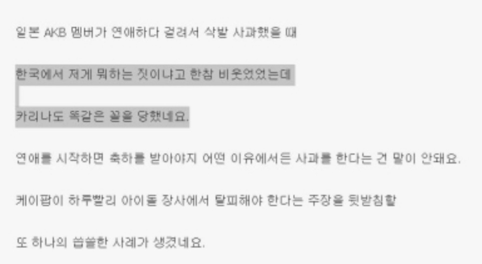 한 네티즌은 6일 온라인 커뮤니티에 "미네기시 미 나미 삭발 사건 당시 한국에서도 '뭐 하는 짓이냐'고 비웃었는데 카리나도 똑같은 꼴을 당했다"며 "연애 를 시작하면 축하받아야지 어떤 이유에서든 사과한 다는 건 말이 안 된다. K팝이 하루빨리 아이돌 장사 에서 탈피해야 한다는 주장을 뒷받침할 또 하나의 씁쓸한 사례가 생겼다"고 지적했다.