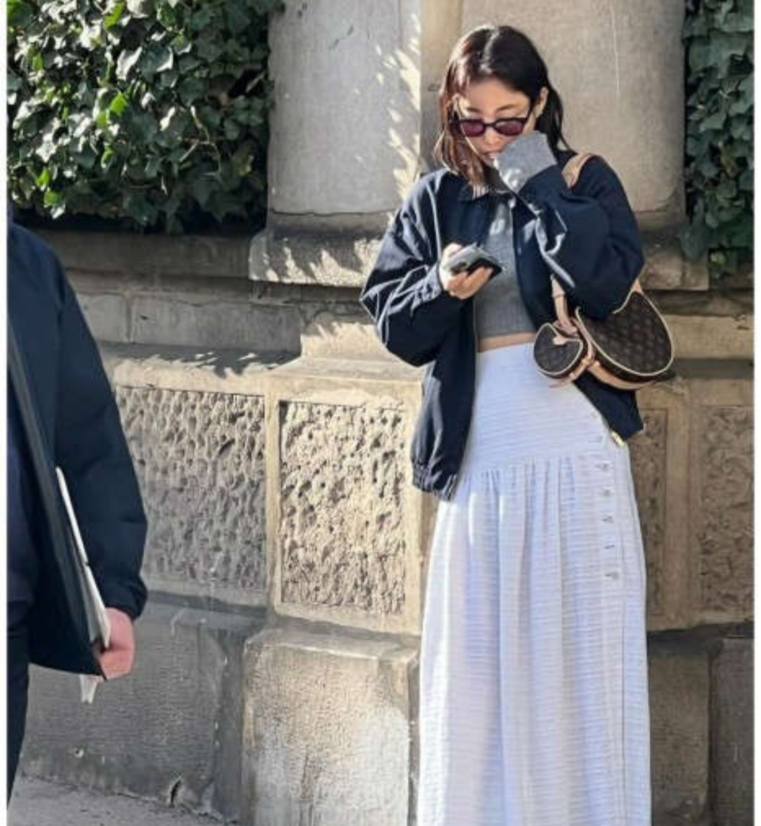 샤넬 화이트 맥시 스커트와 미우미우 크롭 니트 탑, 자켓에 코디한 기은세숄더백은 루이비통 신상 가방 크로와상백입니다.