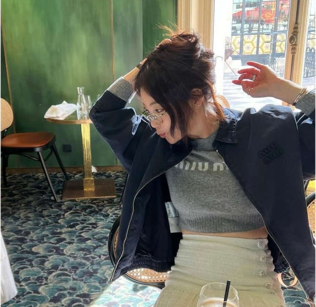 샤넬 화이트 맥시 스커트와 미우미우 크롭 니트 탑, 자켓에 코디한 기은세숄더백은 루이비통 신상 가방 크로와상백입니다.