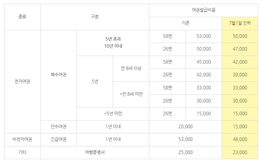 ✅ 발급 비용 -. 전자여권 기준 5년 (58면 42,000원 / 26면 42,000원), 10년 (58면 50,000원 / 26면 47,000원) ※2024.07.01일부터 여권발급 비용 3,000원 인하
