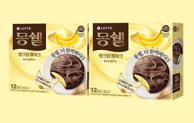 롯데제과는 최근 프리미엄 크림 케이크 몽쉘 바나나 를 리뉴얼해 출시했다. 몽쉘 바나나는 2016년 처음 출시해 한 달 만에 1500만 개의 판매고를 올린 제품 이다. 재출시된 제품은 출시 당시보다 크림을 약 2 0% 늘려 맛과 풍미를 높였다. 촉촉하고 부드러운 카 카오 케이크 속에 달콤한 바나나 크림이 생크림과 함 께 들어간 것이 특징이다. 12개의 몽쉘이 든 패키지 를 온라인 쇼핑몰 한정으로 12,900원에 판매하고 있 다.