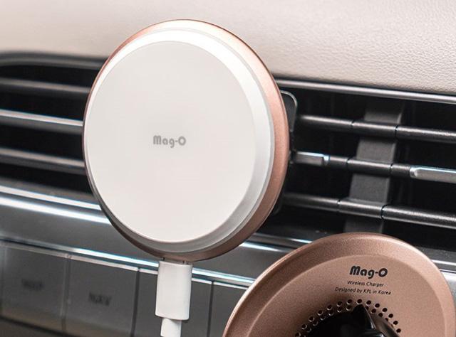 매고 맥세이프 차량용 거치대는 감각적인 디자인을 선택할 수 있는 제품이다. 화이트와 골드가 조화를 이 루는 밝고 고급스러운 색상의 '화이트 메탈릭 로즈골 드', 심플한 블랙에 그린이 가미된 민트 컬러로 포인 트를 준 '블랙 메탈릭 민트'를 선택할 수 있다. 맥세이 프를 지원하며, 15W의 고속 무선 충전 기능을 제공 한다. 푸른색의 엠비언트 라이트 기능도 탑재했다. 본 제품의 판매가는 39,800원이다.