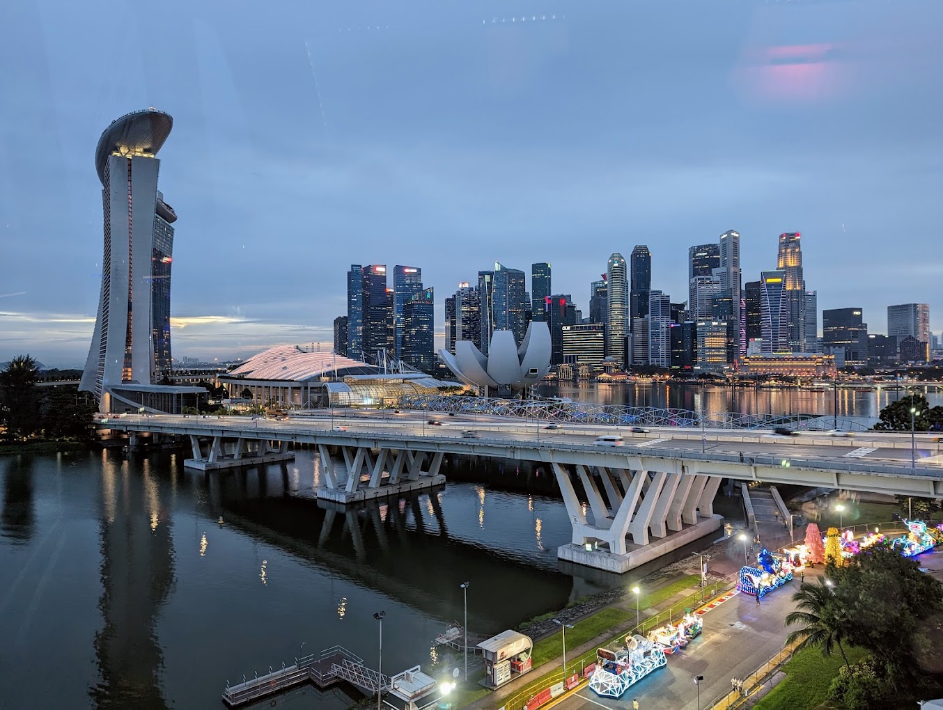 세계에서 가장 큰 거대한 관측 바퀴 인 싱가포르 플라이어를 만나십시오. 그것은 아시아에서 독특한 경험입니다. 3 층짜리 터미널 건물 위에 지어진 싱가포르 플라이어는 지름 150 미터,높이 165 미터이며 초당 0.21 미터로 이동합니다. 28 개의 시내 버스 크기의 에어컨 캡슐은 최대 28 명의 승객을 태울 수 있으며,바퀴를 완전히 회전시키는 데는 약 30 분이 걸립니다.