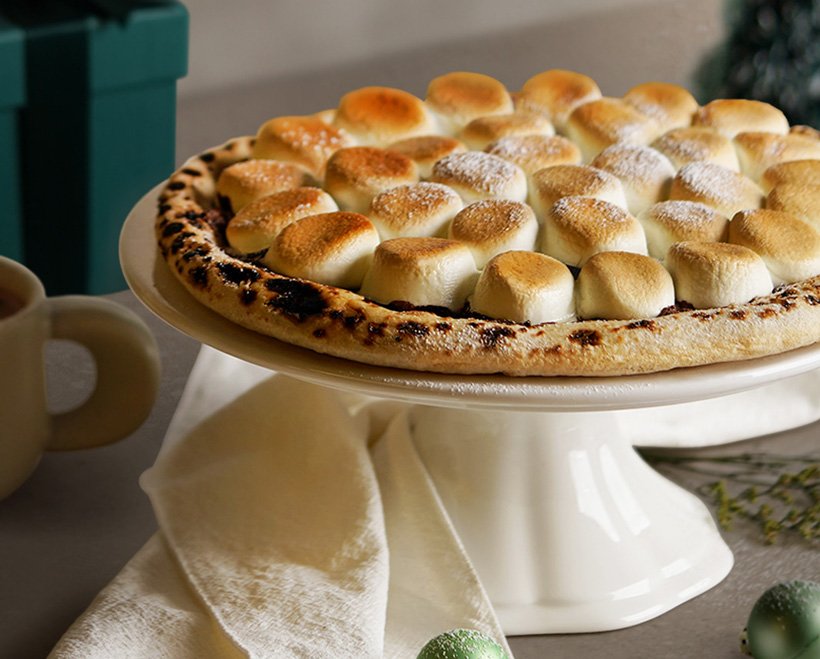 우주인화덕피자는 극한의 단맛을 즐길 수 있는 '마시멜 로우 초코 피자'를 판매하고 있다. '악마의 잼'으로 유 명한 헤이즐넛 초코 스프레드에 푹신한 마시멜로를 듬 뿍 얹은 제품이다. 겉은 노릇노릇하게 구워졌고 속은 쫀득한 식감을 가진 마시멜로와 부드럽고 달콤한 초콜 릿이 조화를 이루는 메뉴로, 마치 스모어 딥을 먹는 듯 한 느낌을 받을 수 있다. 공식몰에서 한 판에 11,600원 의 판매가로 판매 중이다.