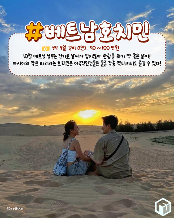 10월의 베트남 남부 건기로 여행을 떠나기 가장 좋은 시기입니다. 남부의 대표적인 여행지 호치민은 아시아의 작은 파리라고 불리며, 이국적인 건축물들과 아름다운 거리 풍경을 만나볼 수 있습니다.