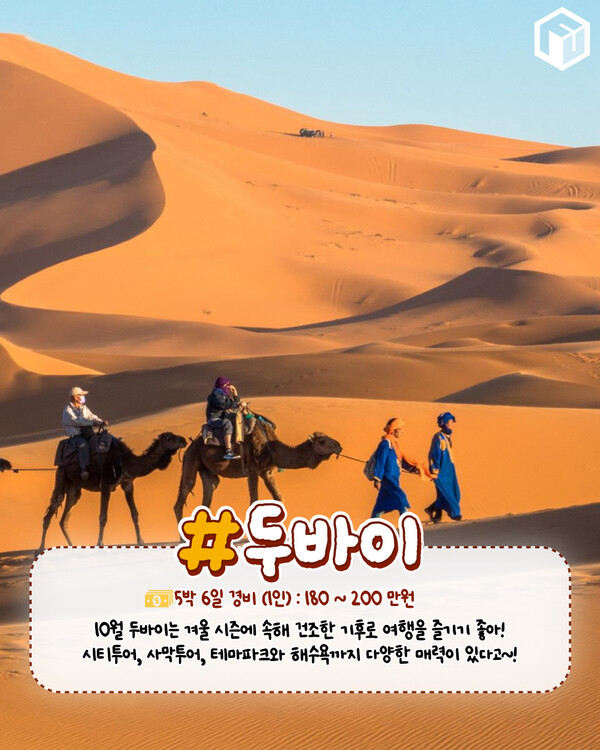 첫 번 째 소개해드리는 10월 해외여행지는 두바이입니다. 10월 두바이는 겨울 시즌으로 다소 덥지만 건조한 기후로 여행을 즐기기 좋습니다. 특히 두바이는 중동의 허브로 항공편이 많아 비교적 저렴하게 비행기표를 구매하실 수 있는데요.