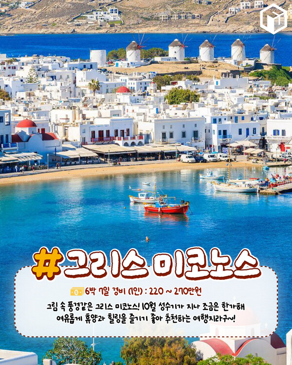새하얀 건물과 짙푸른 바다로 마치 그림 속 풍경같은 그리스 미코노스입니다. 10월 그리스 미코노스는 성수기가 지나 비수기로 비교적 한산한데요. 그래서 더욱 여유롭게 휴양과 힐링을 만끽할 수 있어 추천드리는 해외여행지입니다.