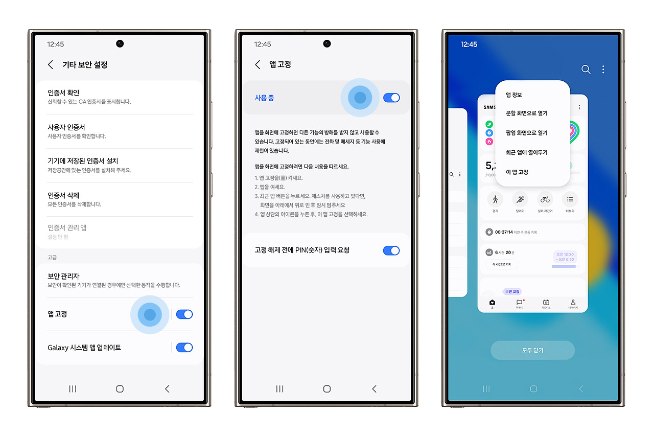 - 설정 > 생체 인식 및 보안 > 기타 보안 설정 > 앱 고정 버튼 활성화