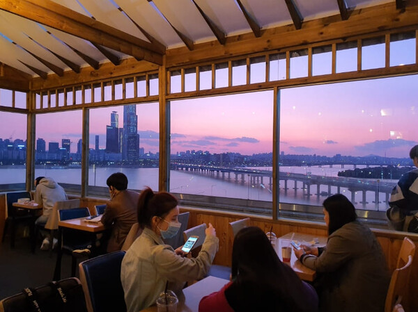 채그로는 창가석, 테이블석 등 좌석과 층에 따라 운영방침이 조금씩 다르므로 입장시 꼼꼼히 확인한 뒤 자리를 잡을 것을 추천합니다. 북카페로 운영되고 있지만 여유롭게 독서를 즐기는 사람, 개인 작업을 하는 사람, 조용히 대화를 즐기는 사람 등 한강뷰를 감상하며 저마다의 방식으로 시간을 보내는 것을 볼 수 있죠.