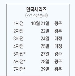 - 2024년 한국시리즈는 10월 21일부터 10월 29일까지 열리며, 1차전과 2차전은 정규 시즌 1위팀의 홈구장에서 진행됩니다.