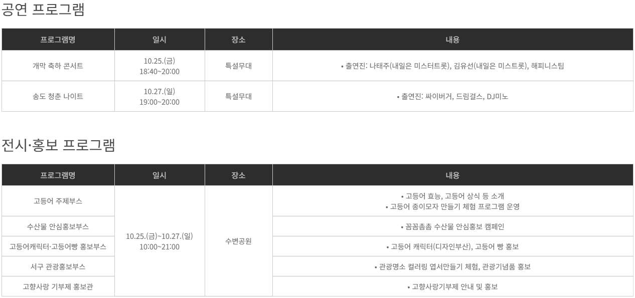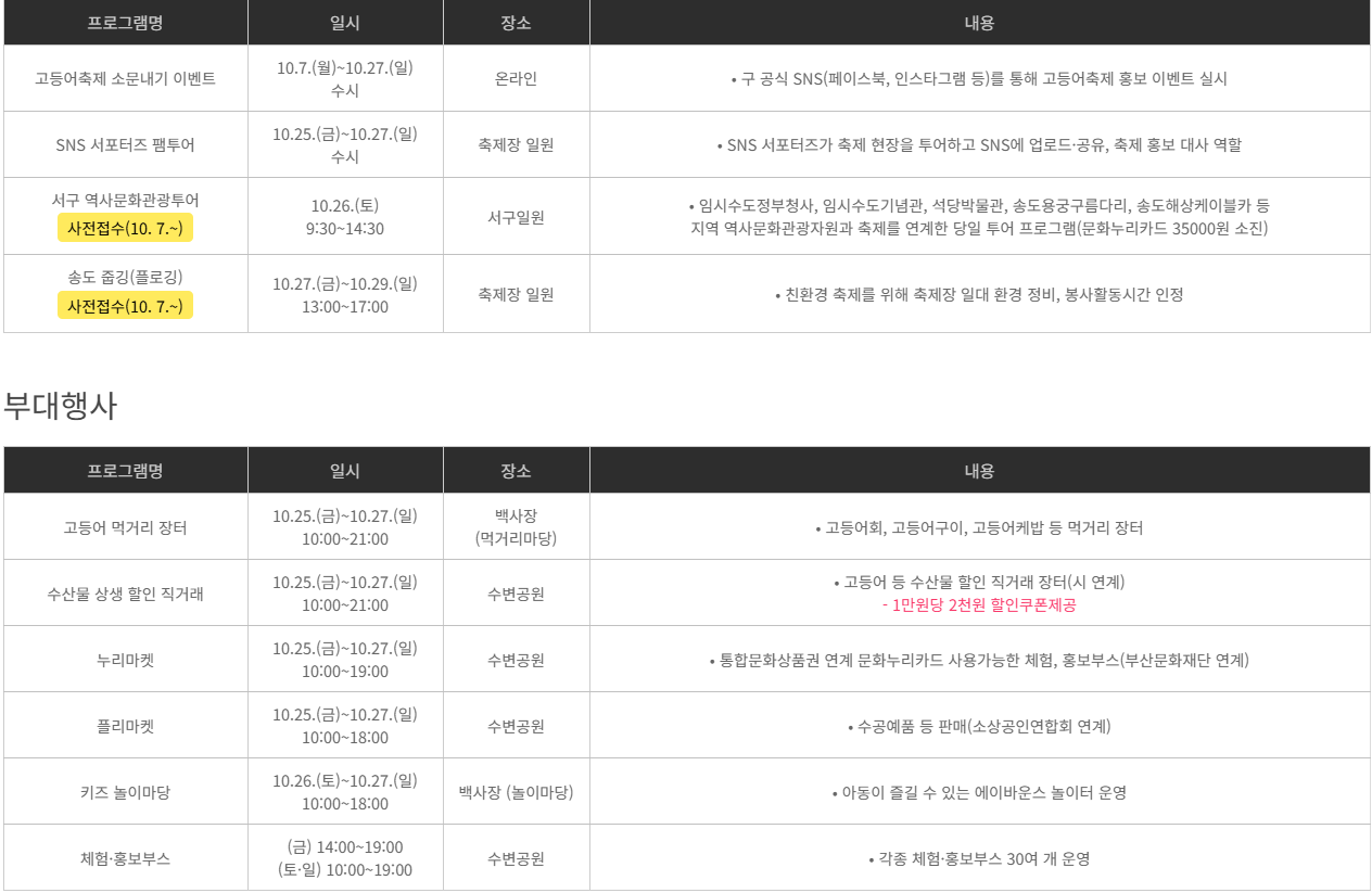 국민생선 고등어를 테마로 수산업 관계자와 지역 주민이 함께 기획하고 참여ㆍ홍보함으로써 단순한 먹거리 축제가 아닌 볼거리, 즐길거리가 있는 문화예술축제이자 수산 관련 산업을 육성ㆍ발전시키는 대한민국 대표 수산업 문화축제로 명성이 높아지고 있으며 대표 프로그램인 부산공동어시장 현장체험, 맨손 고등어 잡기, 고등어 깜짝 경매를 비롯한 카약 타고 고등어 찾기, 고등어 요리왕을 찾아아, 고등어맨 종이배 경주대회, 고등어 먹거리장터 등 독특하고 참신한 체험ㆍ투어ㆍ전시ㆍ경연ㆍ공연 프로그램을 운영해 국내외 관광객들에게 이색적인 축제 향유의 기회를 제공하고 있으니 많은 관심과 부산여행을 오셔서 행복한 추억을 많이 쌓아가세요~!!!