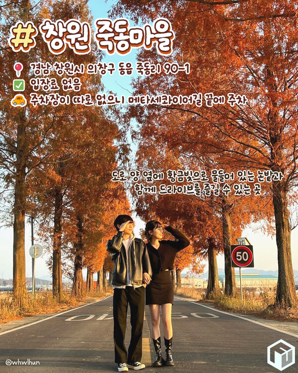 경상남도 창원에 위치한 죽동마을 메타세콰이어 길은 가을 주황빛으로 물든 메타세쿼이아들과 양 옆에 황금빛으로 물들어 있는 논밭이 조화롭게 어우러진 가을 명소입니다.