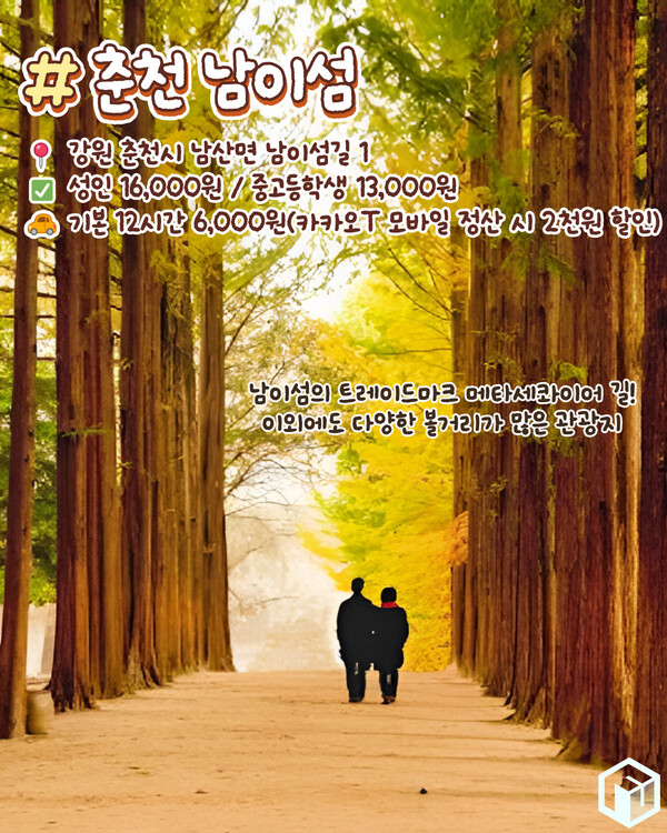서울 당일치기로 방문하기 좋은 춘천 남이섬입니다. 가을이되면 남이섬 전체가 단풍으로 뒤덮여 환상적인 풍경을 선사합니다. 섬 어느 곳을 방문해도 환상적인 풍광을 볼 수 있지만 특히 은행나무길과 메타세쿼이아길은 꼭 빼놓지말아야할 남이섬 대표 스팟입니다.