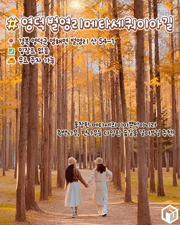 4계절 명소인 벌영리 메타쿼이아길은 여름에는 영덕 바다에서 불어는 시원한 바람을 느낄 수 있으며 가을에는 메타세쿼이아 나무 사이 사이로 가을 포근한 햇살과 가을 바람을 즐기며 가을의 정취를 듬뿍 느낄 수 있어 가을 명소로 추천드립니다.
