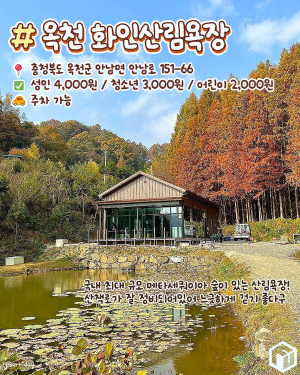 금강의 물줄기 흐르는 인근 옥천 화인산림욕장은 국내 최대 규모의 메타세쿼이아 숲이 있는 산림욕장입니다. 특히 화인산림욕장 내은 메타세쿼이아 나무들은 가을철 산책로를 따라 걸으며 힐링을 즐기기 좋습니다.