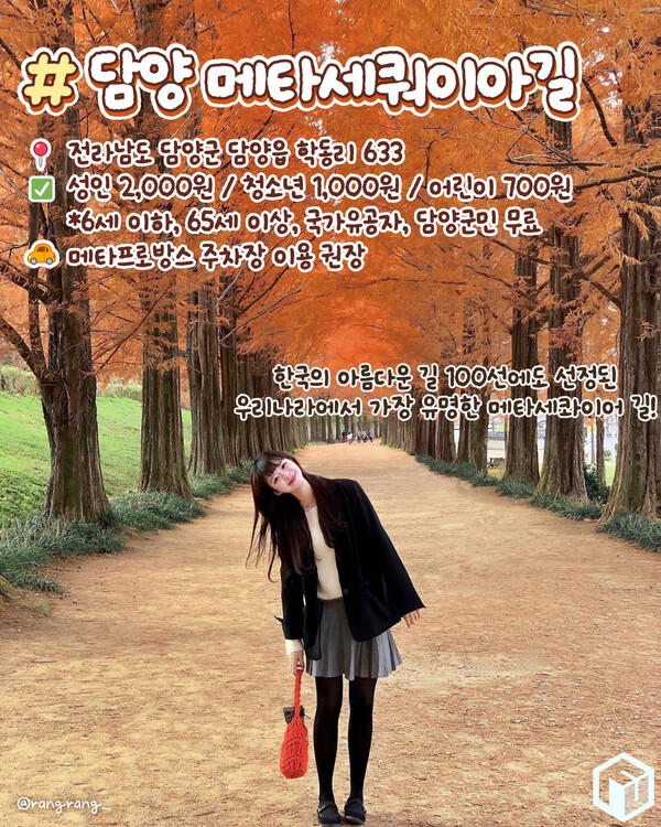 또 담양 메타세콰이어길외 담양에는 메타프로방스, 담양관방제림등 가을철 방문하기 좋은 명소도들도 있으니 함께 방문해보시길 바랍니다.