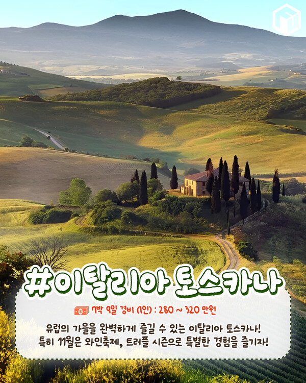 또한, 풍요로운 자연과 함께 피렌체와 시에나 같은 역사적인 도시에서 고풍스러운 건축물과 미술관을 둘러보며 고즈넉한 여행을 즐길 수 있어 추천드리는 11월 해외여행지입니다.