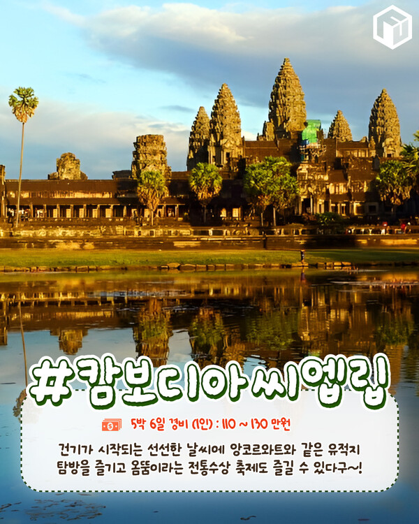 뿐만아니라 세계문화유산인 앙코르 와트에서 일출을 감상하거나, 바이욘 사원과 타프롬 사원에서 고대 도시의 신비로운 분위기를 느낄 수 있어 11월 특별한 해외여행지로 추천드리는 캄보디아 씨엠립입니다.
