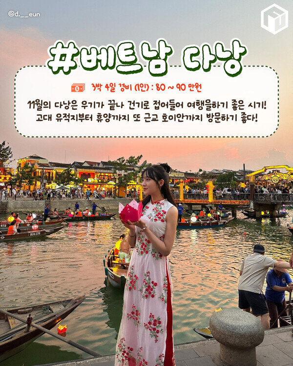 미케 비치와 바나힐, 오행산 등 자연경관이 빼어난 명소가 많아 휴양지로도 좋습니다. 뿐만아니라 가까운 호이안까지 당일치기 여행도 가능해 11월 해외여행지로 추천드립니다.