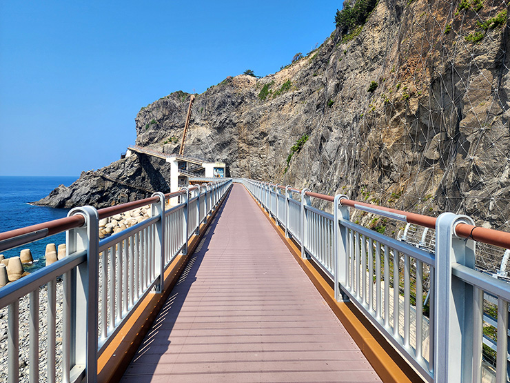 과거 이 길을 걸을 때는 저쪽 절벽의 잔도길이 유일한 길이었고 위쪽으로 달팽이 계단 길이 이어졌었으나 현재 달팽이 계단 길은 철거되었고 잔도길은 통행 불가다. 아마도 잔도길을 다시 이용하려면 보강과 안전진단 이후에나 가능할 것이고 어쩌면 철거가 될 수도 있을 거라 생각된다.