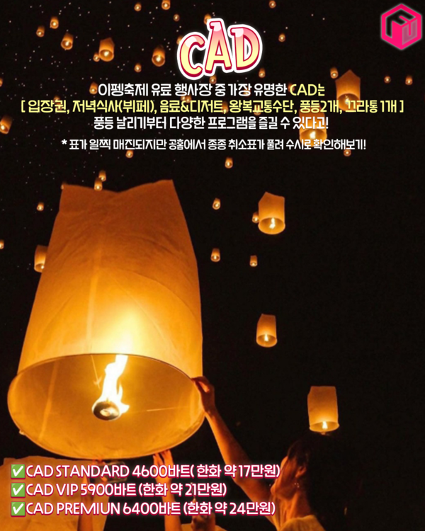 공식 CAD 유료 행사에서는 입장권, 저녁식사(뷔페), 음료&디저트, 왕복교통수단, 풍등2개, 끄라통 1개 포함된 패키지로 교통, 식사부터 각 종 볼거리까지 보다 편리하게 이펭 축제를 즐길 수 있습니다.