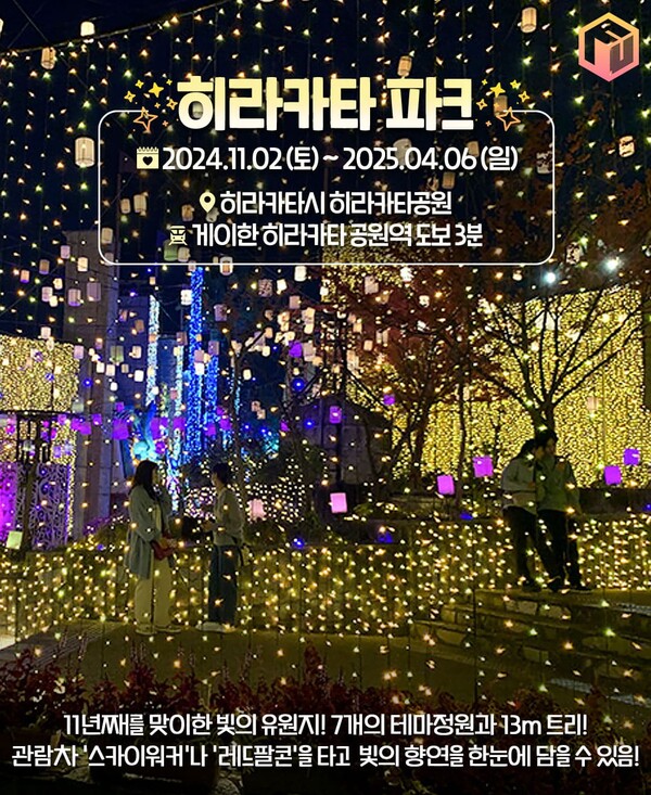 오사카 히라카타파크에서는 11회를 맞이한 일루미네이션 '빛의 유원지'가 펼쳐집니다. 히라카타 파크 일루미네이션은 꽃을 테마로 하고 있으며 나비와 자연을 표현한 빛 장식이 펼쳐집니다. 총 7개의 테마로 다양한 일루미네이션 공간이 조성되어 있는데요. 높이 13m의 트리가 크리스마스 분위기를 물씬 자아냅니다.