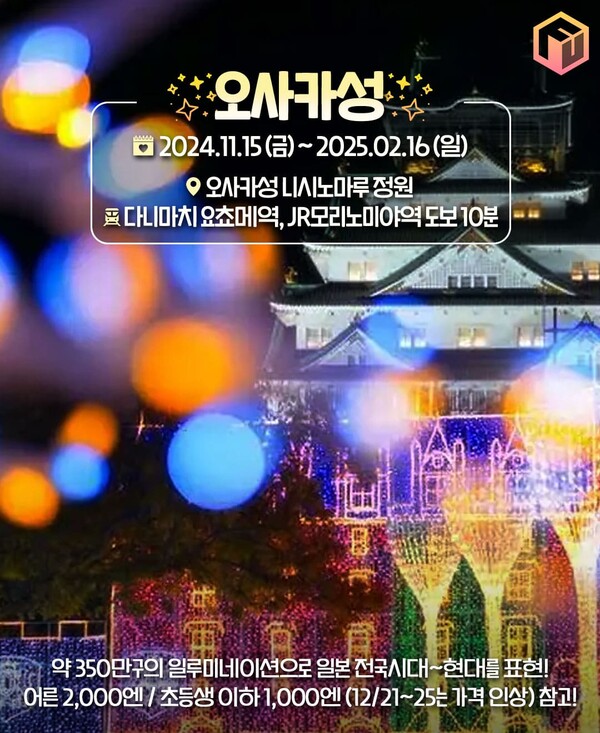 오사카의 대표 여행지 오사카성은 2024년 11월 15일부터 2025년 2월 16일까지 일루미네이션 축제를 개최합니다. 오사카성과 니시노마루 정원 일원에서 펼쳐지는 빛 축제는 약 350만구의 전구로 일본 전국시대부터 현대 시대를 표현해냈는데요.