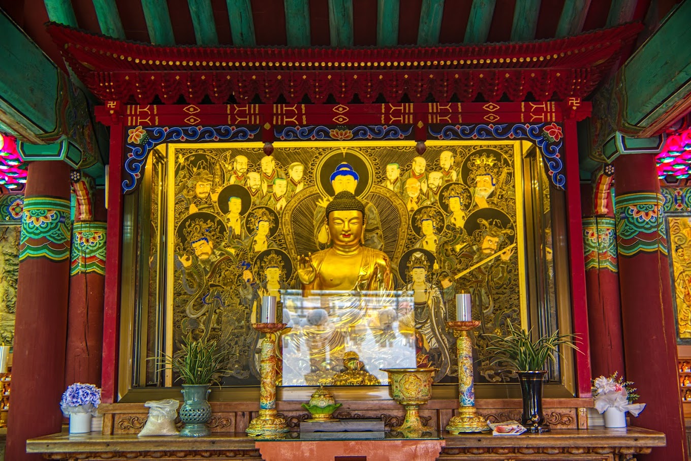 서구람 동굴은 토함 산에 있는 석조 사원이다. 유네스코 세계문화유산은 경덕왕 때인 751 년으로 거슬러 올라간다. 둥근 모양의 홀에는 3.5 미터 높이의 본존 동상이 있으며,이는 롯데 조각된 무대에 앉아있는 웃는 부처님을 나타냅니다.