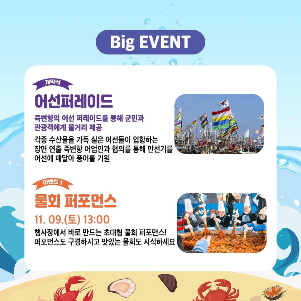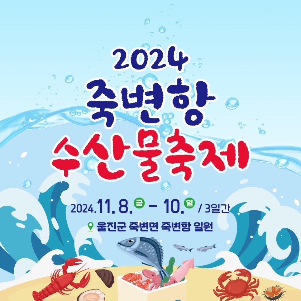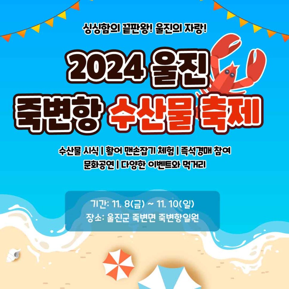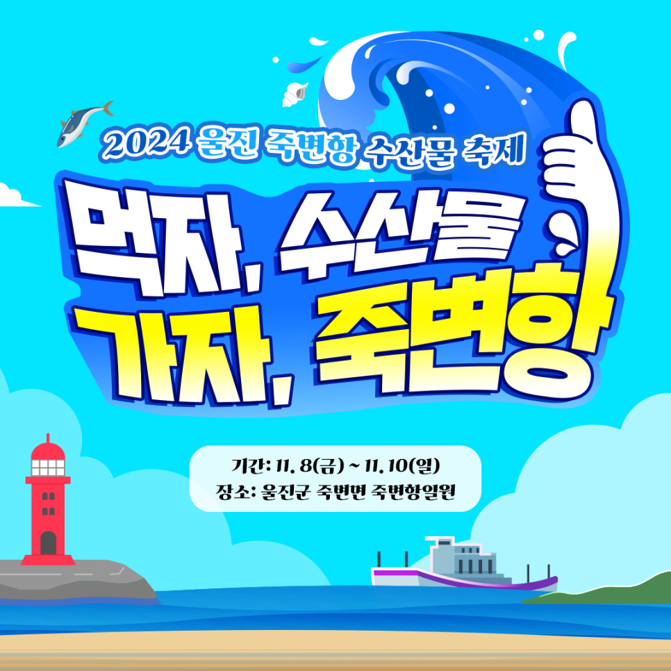 11월 8일 금요일 울진 죽변항 일원에서 개최되는 울진 죽변항 수산물 축제 주제는 ‘먹자, 수산물 가자, 죽변항’입니다.