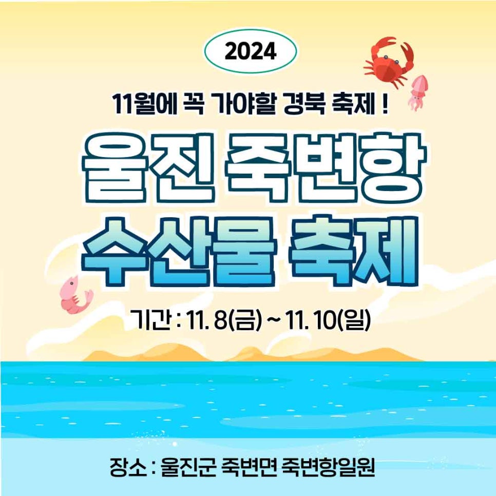 11월에 꼭 가야할 경북 축제! 울진 죽변항 수산물 축제는 다가오는 11월 8일(금)부터 11월 10일(일)까지 울진 죽변항 일원에서 성대하게 개최됩니다.
