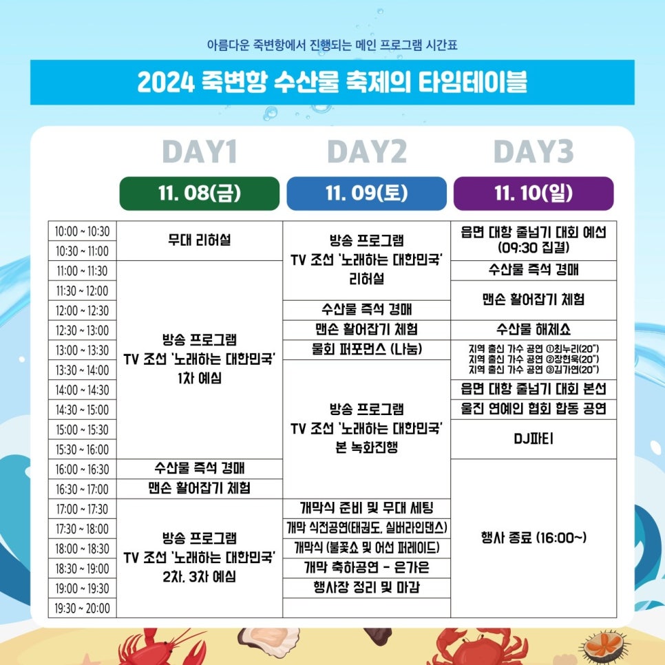 이상으로 11월 경죽 축제 중 가장 핫한 울진 죽변항 수산물 축제 소식과 출연 가수 라인업, 주차장, 주변 가볼만한 곳을 알아보앗습니다. 싱싱한 수산물과 공연, 체험 거리가 준비된 죽변항으로 여행 떠나보시길 강추합니다.