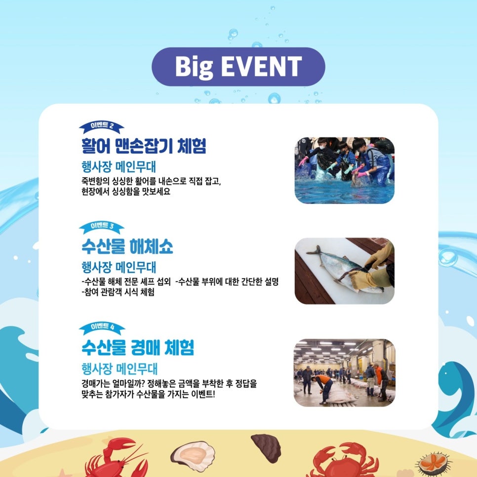 수산물 해체 전문 셰프가 수산물 부위에 대한 설명과 직접 해체한 수산물은 무료 시식 행사까지 열린다고 하니 이것만은 놓치지 말아야겠습니다.