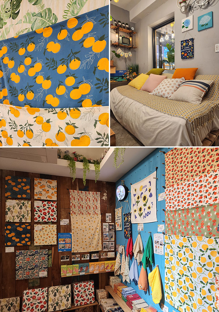 펫 전용 용품은 한쪽 면을 장식하고 있고 다른 곳은 프린트된 패브릭이 마치 손수건처럼 보이는 소품들.