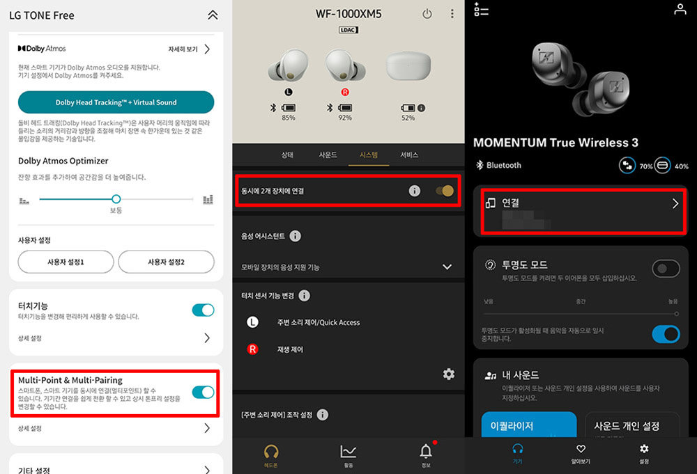 * LG 톤프리, 소니 헤드폰: 다양한 기기와 멀티 포인트 페어링 지원