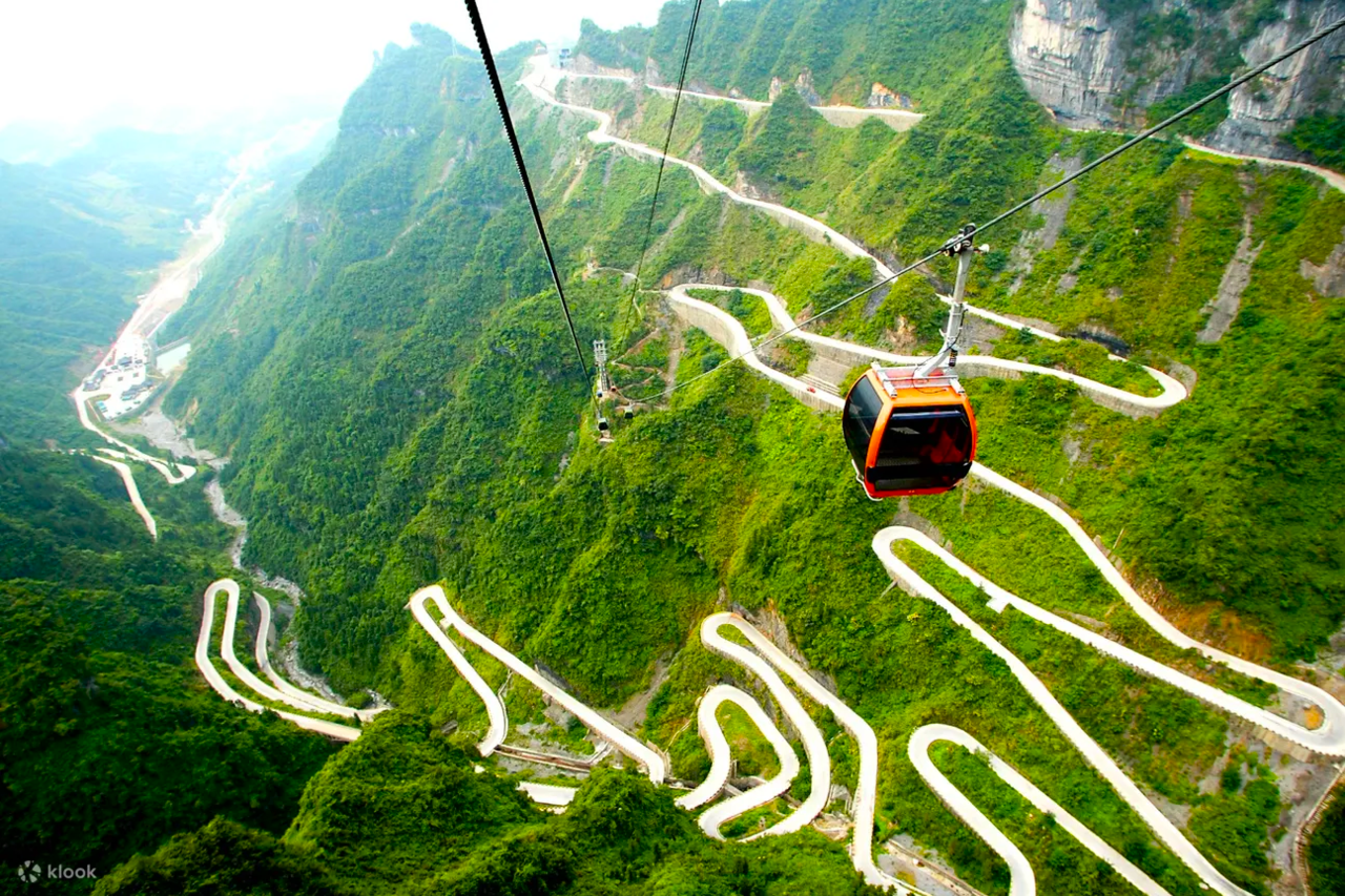 장가계 시내에서부터 천문산 정상까지 연결되며, 탑승 시간만 무려 30분에 이릅니다. 케이블카를 타고 오르는 동안, 끝없이 펼쳐진 기암절벽과 구불구불한 길을 360도 파노라마뷰를 즐겨보세요.